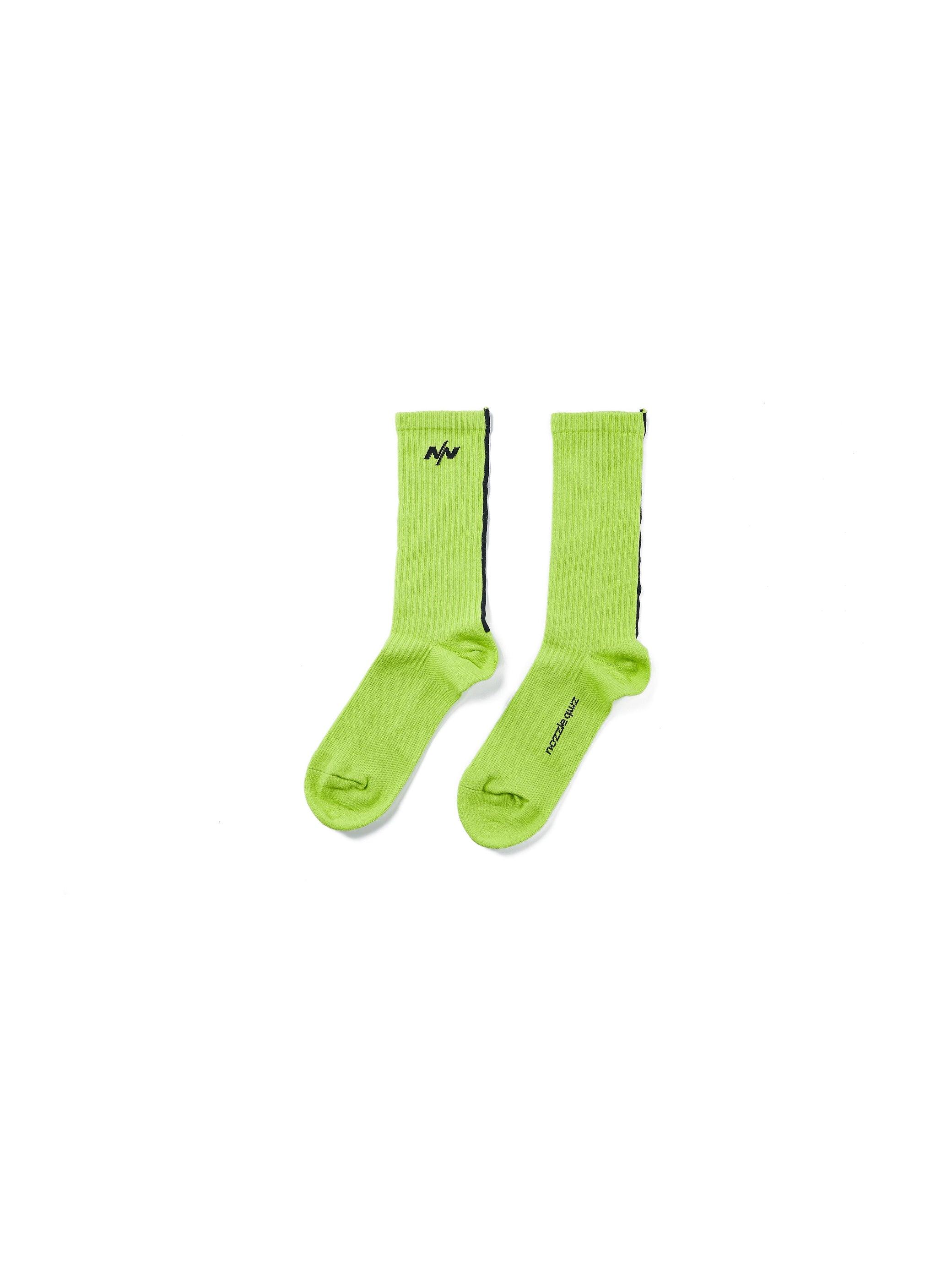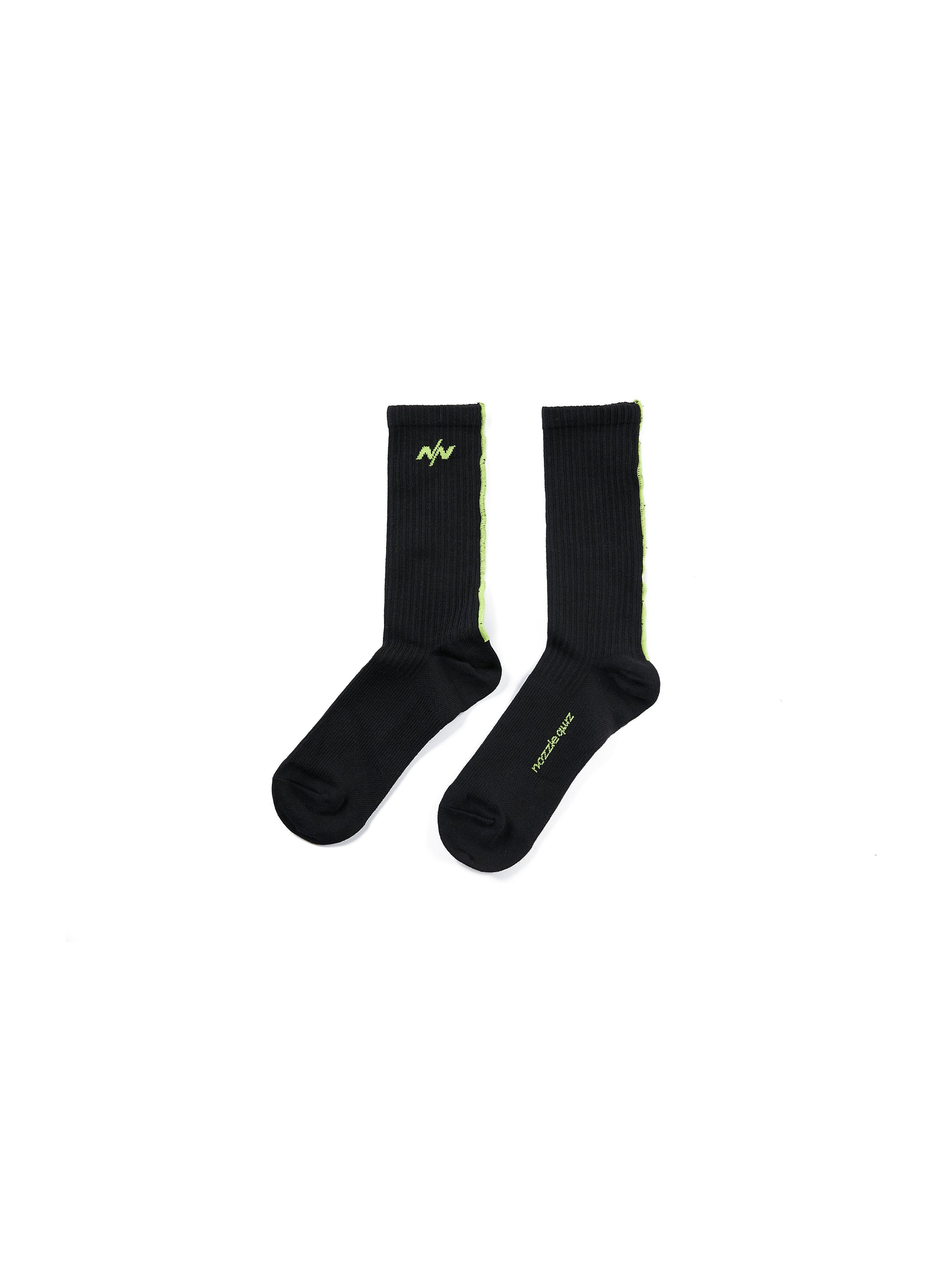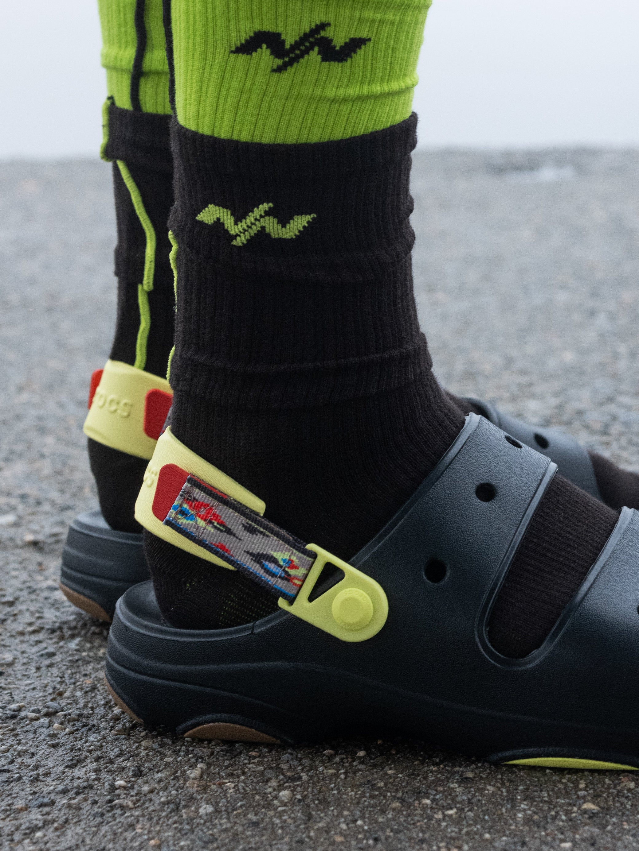 The All Terrain Socks by nozzle quiz is a collaboration between two functional apparel powerhouses as part of the “All Terrain” Collection. The sock features the signature elements by nozzle quiz including LYCRA® and SKINLIFE®. Allowing the sock to be durable and flexible without losing any breathability. The sock is presented in the signature “All Terrain” colorway and will be available in Black/ Neon Green