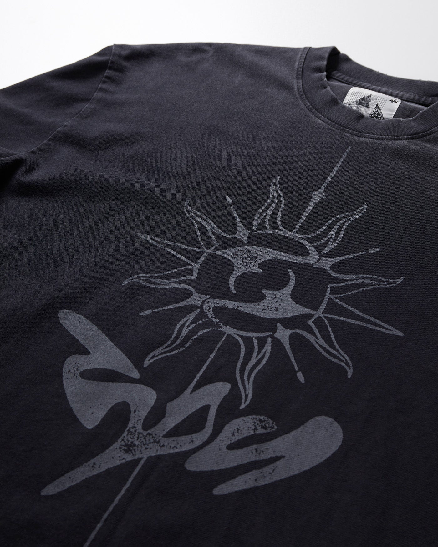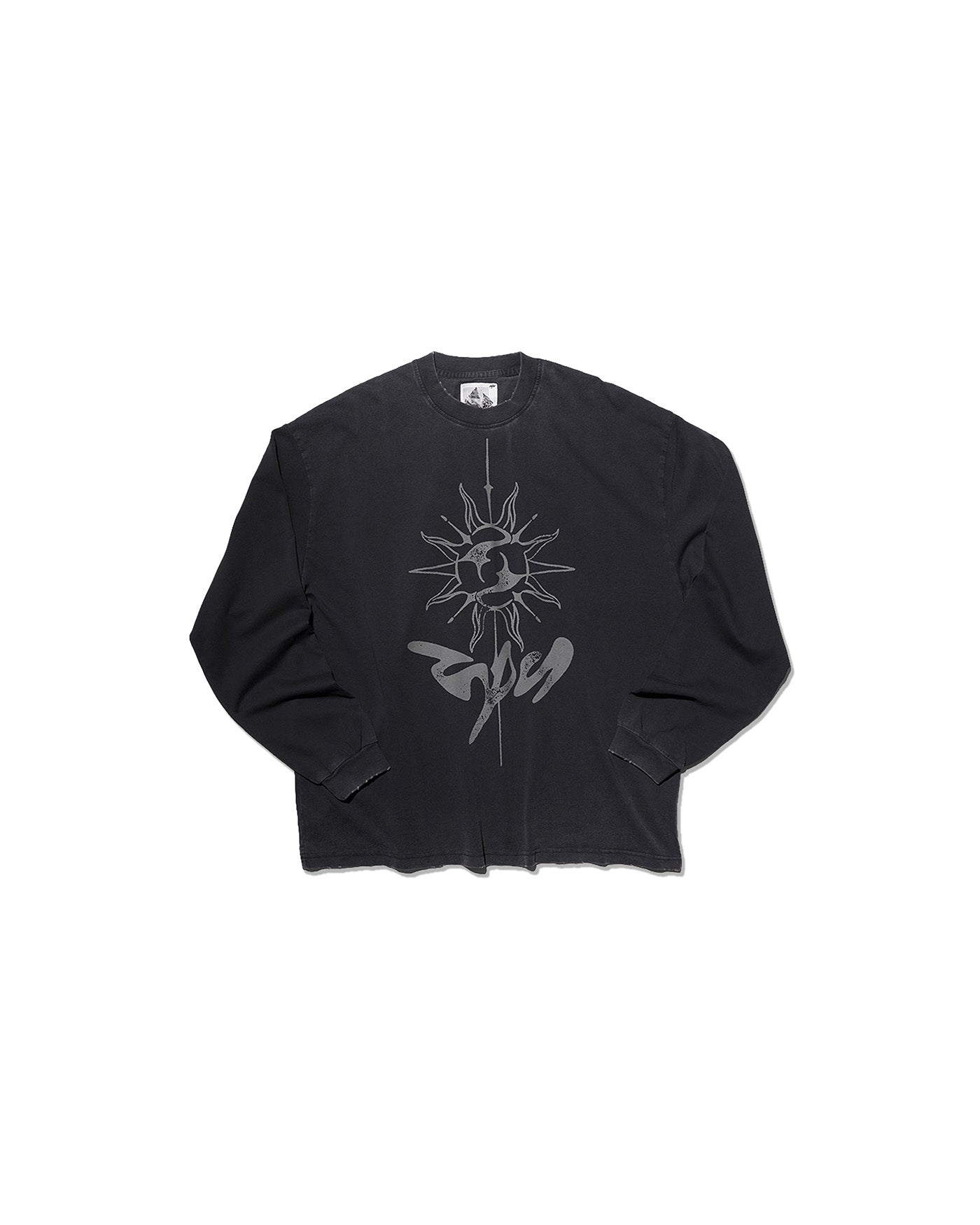 At its core, a central sun-orbit graphic represents energy and motion—symbolic of NīNEpointNīNE’s seasonal theme, The Spiral. The oversized print is executed in matte pigment ink for a lived-in aesthetic. Finished with ribbed cuffs and tonal neck detailing, The Sun L/S Logo Tee merges cosmic symbolism with everyday wearability.